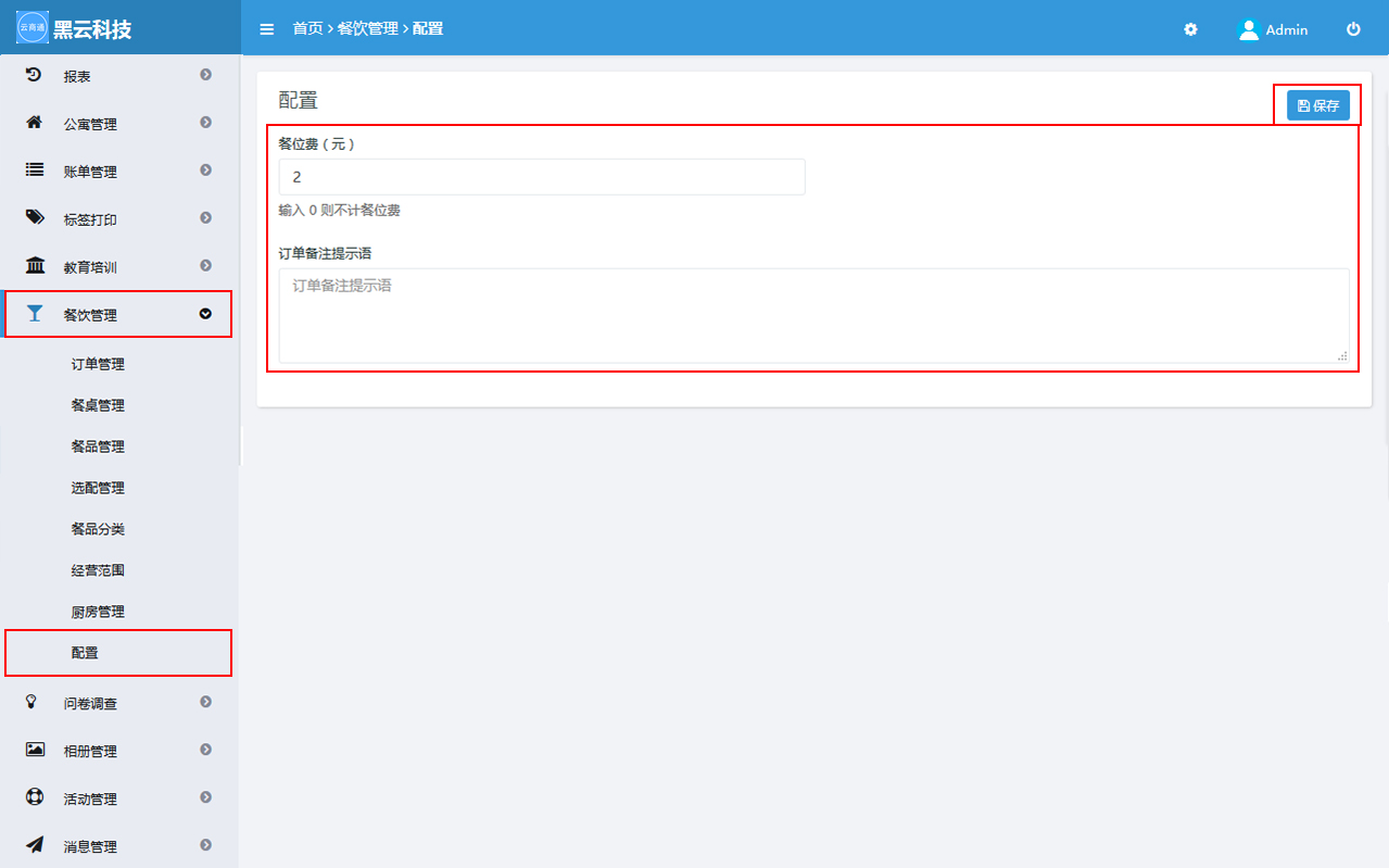 登陆后台,点击左侧导航栏【餐饮管理】—【配置】,填写配置信息,点击右上角【保存】按钮即可完成配置设置。具体操作如下图: