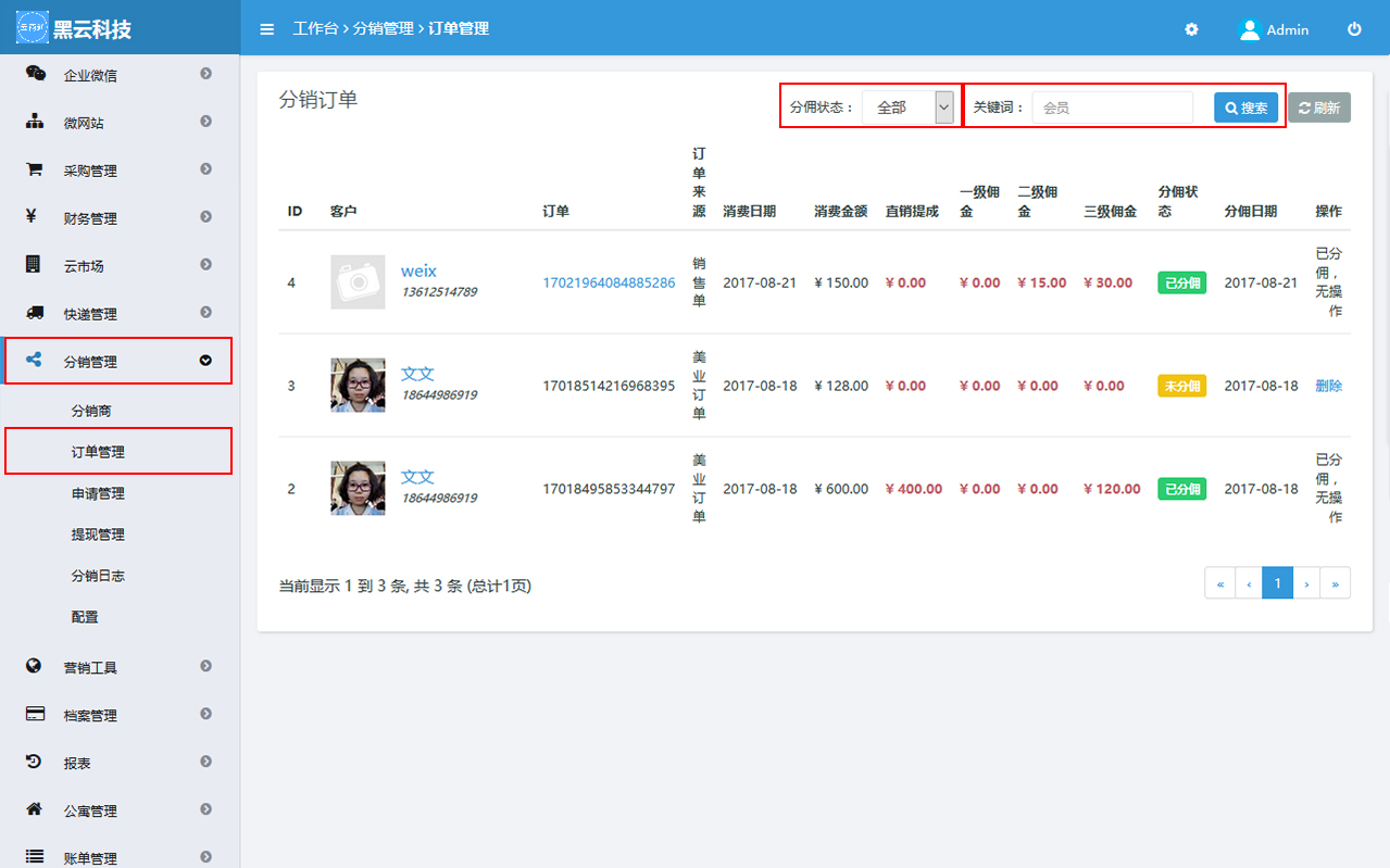 登陆后台,点击左侧导航栏【分销管理】—【订单管理】可查看所有客户的订单,可选择分佣状态(全部、失效、未分佣、已分佣、有疑问)查看该状态下的所有订单;输入关键字(会员名称)点击【搜索】可查看该会员的所有订单。具体操作如下图: