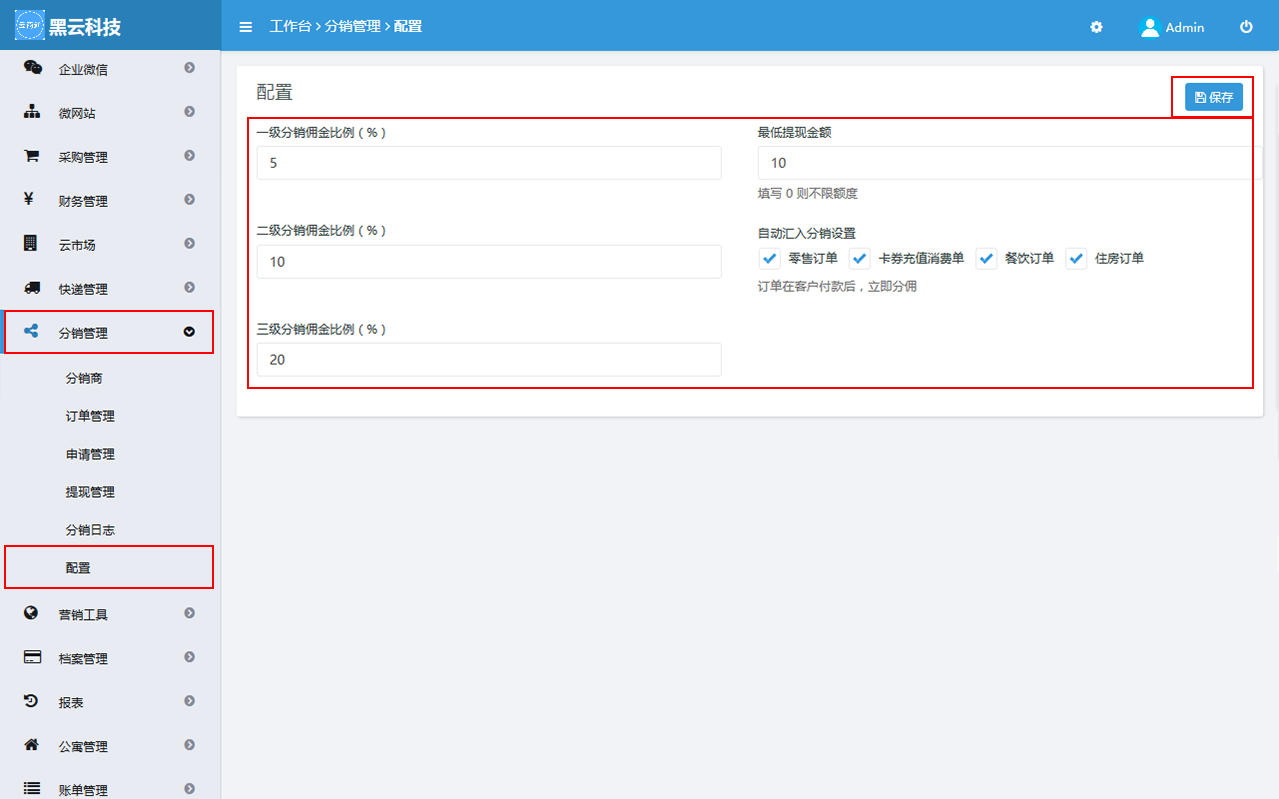 登陆后台,点击左侧导航栏【分销管理】—【配置】,设置一级分销佣金比例、二级分销佣金比例、三级分销佣金比例、最低提现金额及自动汇入分销设置,设置完成后点击右上角【保存】即可完成对分销的配置。具体操作如下图: